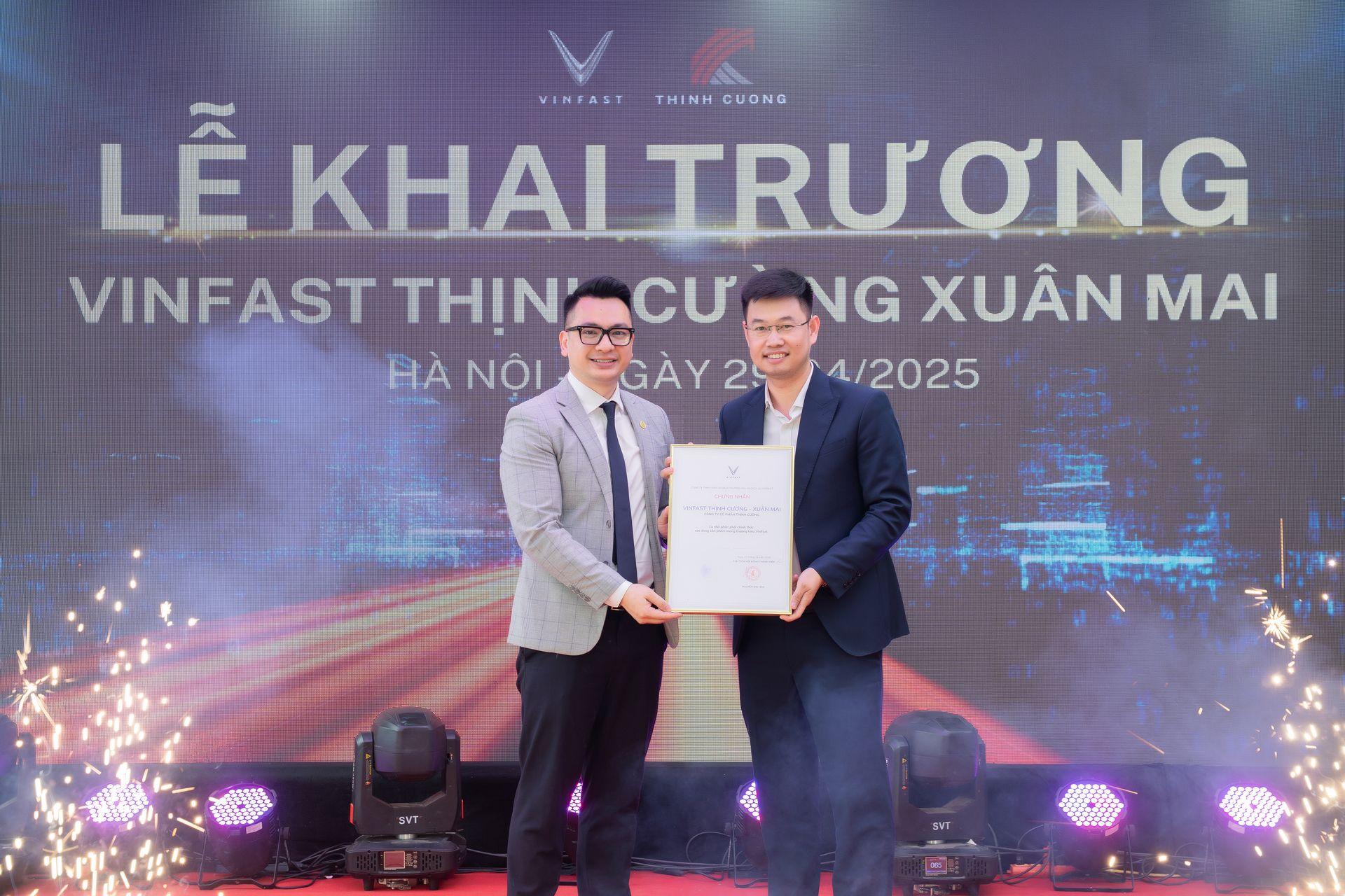 Một trong những điểm nhấn không thể thiếu là lễ trao chứng nhận “Nhà phân phối chính hãng VinFast” dành cho Showroom Xuân Mai, đánh dấu sự công nhận chính thức từ Tập đoàn.